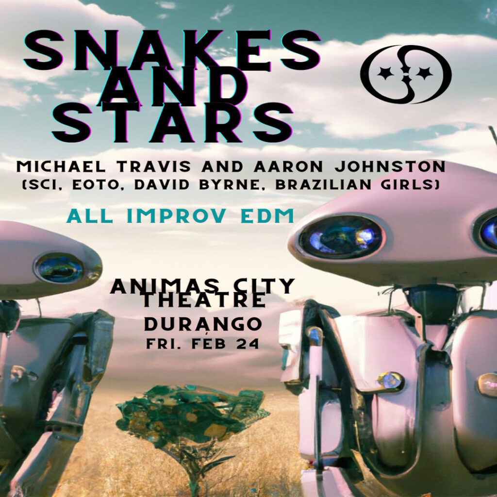 Animas City Theatre PresentsSnakes and Stars ft: Michael Travis (The String cheese Incident) & Aaron Johnston (Brazilian Girls,David Byrne)Friday February 24th 21+ / Doors 7:00pm / Show 8:00pmTickets on sale now online at www.animascitytheatre.comHow it came to be: Snakes and Stars is offering a sneak preview of a landmark, new project of Michael Travis (The String Cheese Incident) and Aaron Johnston (Brazilian Girls, David Byrne’s American Utopia). Long time friends and collaborators, Michael and Aaron were looking for new avenues of musical creation when Michael reached out to see what Aaron thought of a new idea. Michael had a concept of a new Electronic Duo and Aaron was intrigued. They got together to check it out and it worked! It worked very, very well! The musical visions synchronized in an incredibly fruitful way, and out of the ether, Snakes and Stars was born.The Sound: Snakes and Stars is two of live music’s top drummers exploring various idioms of electronic and dance music in a live, improvisational format. While DJs play previous recorded tracks Snakes and Stars plays everything live and makes up the songs as they go. Relying on a combined 60 years of live music experience, Travis and Johnston utilize vocals, synthesizers, electronic pads and triggers, drum kit, guitar, bass and samples to create a one of a kind musical experiences in the moment. Every show is a unique experience; a playful interaction between the two artists, audience and the surrounding energy they collectively create together to guide the music. No two shows will ever be the same. The band finds its inspiration in deep electronic roots from minimal, trance, techno and house along with contemporary electronic stylings like trap and dubstep , Snakes and Stars is a leap forward in today’s live music scene, mixing both traditional drumming and the most contemporary of sounds. Each one of these unique experiences are not to be missed.